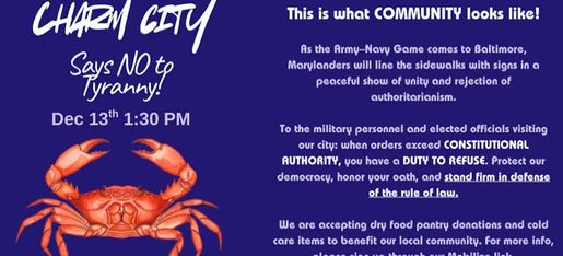 Sat. Dec. 13, Trump is coming to Baltimore for the Army-Navy game. Let's show this administration what Baltimore is really about: caring for our community! There are 30 spots (first come-first serve) at Federal Hill, 1040 William St., 21230. It's a 15 min. walk to the stadium. Please bring items for the school's new food pantry: granola bars, juice boxes, peanut butter, crackers, heat-and-eat (pop tops) Mac & Cheese, ravioli, fruit or applesauce cups, cereal and instant oatmeal packets, between 1 and 4 pm.